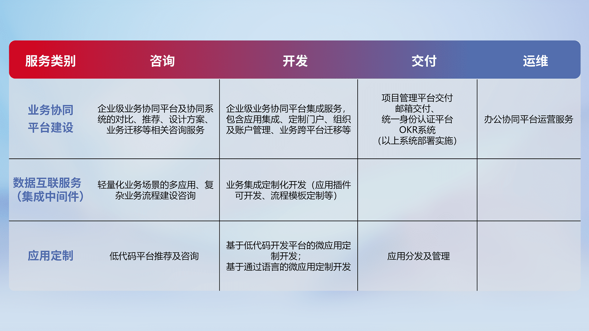 针对钉钉、、企微、、IDaas等平台级产品提供产品的规划、、方案、、、、交付、、定制化开发等服务,,,实现如统一协同办公、、、智能客户服务、、、、混合会议管理、、智能数据查询、、等业务场景,,,,实现数字化转型。。